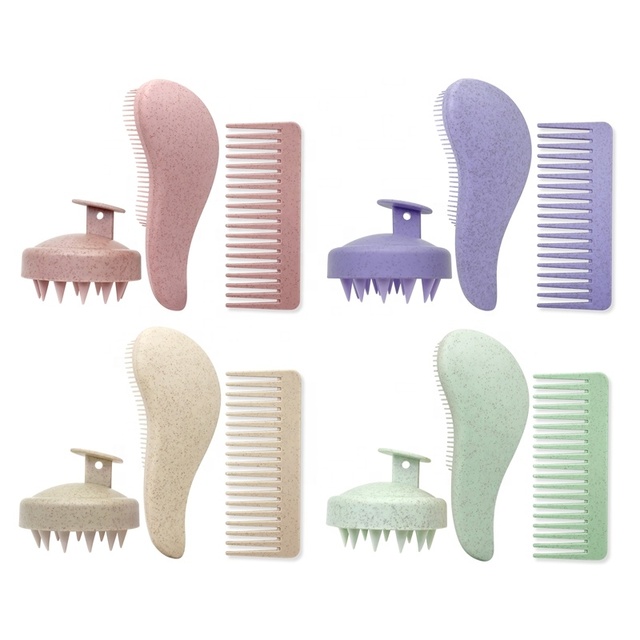 Logo personalizzato 4 pezzi eco-friendly paglia di grano districante spazzola massaggiatore per il cuoio capelluto set di pettine a denti larghi per la crescita dei capelli
